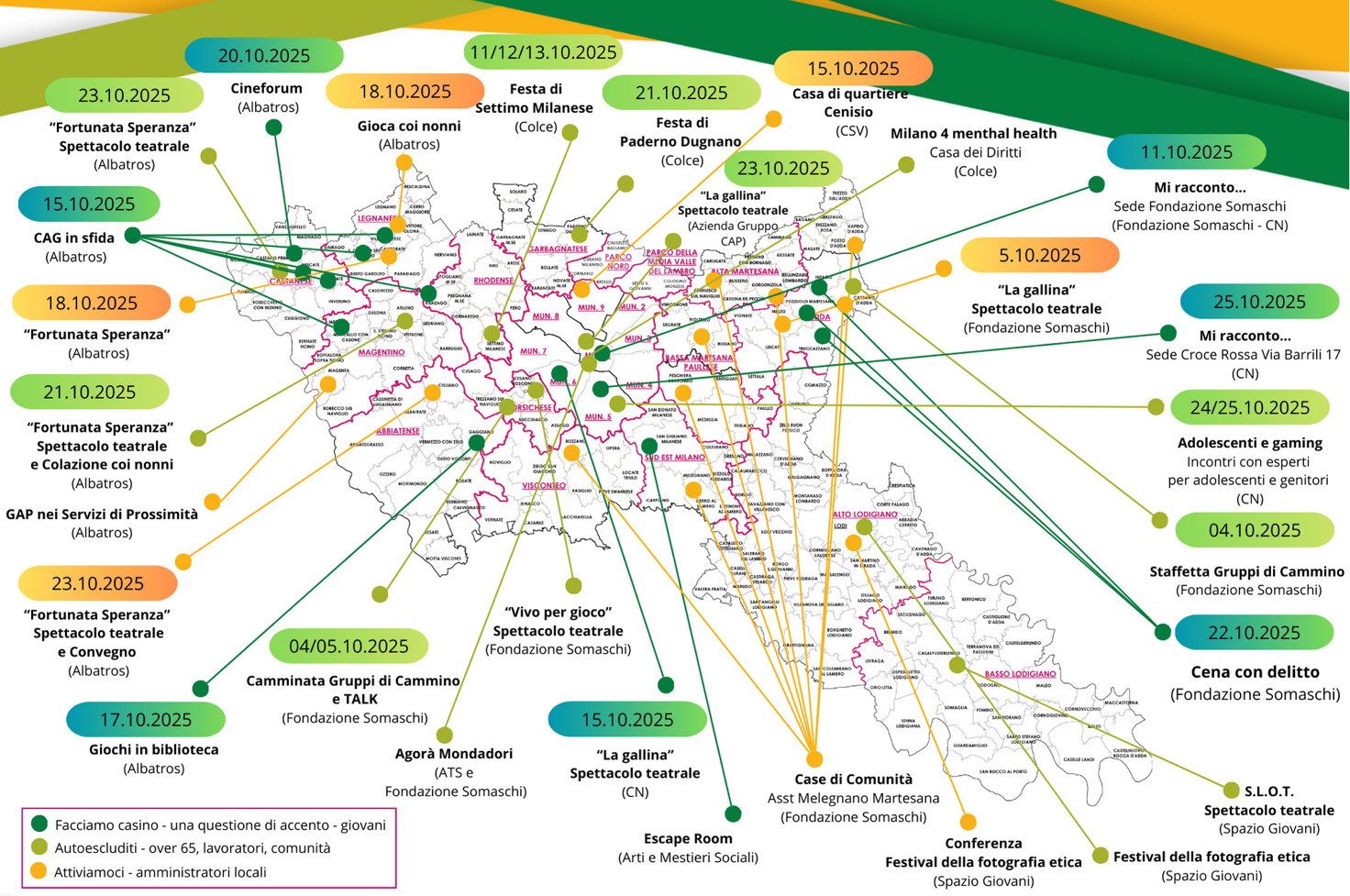 Si tratta di un festival diffuso sul territorio milanese e di Lodi, a cui partecipano numerose organizzazioni del terzo settore che collaborano con ATS su questa tematica, un evento articolato pensato nell’ambito del Piano Operativo Locale GAP di ATS Città Metropolitana di Milano per coinvolgere sulla tematica tutta la popolazione, dagli amministratori locali ai semplici cittadini.