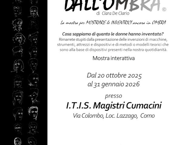 “DONNE FUORI DALL’OMBRA” è una mostra creata da una donna e pensata per portare in luce le donne inventrici, rivolta a chi crede che parlare di intelligenza, competenza tecnologica e pari opportunità di genere apra nuovi orizzonti e permetta di arricchire le proprie conoscenze.